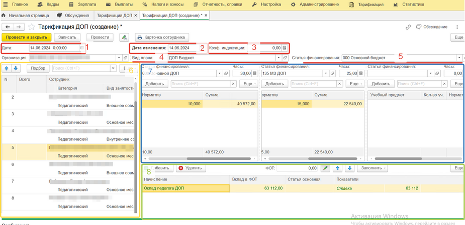 Тарификация ДОП создана для тарифицирования сотрудников учреждений дополнительного образования. Документ "Тарификация ДОП" можно найти и создать в разделе "Тарификация" → "Тарификация ДОП" → "Создать"