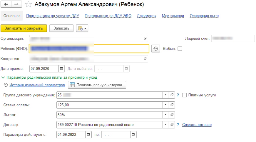 1) Параметры родительской платы за присмотр и уход. Обязательно наличие всех заполненных полей ниже на рисунке. Обратите внимание на Договор. Договор является основным полем, который является идентификатором ребенка. Нельзя пере создавать договор, если у ребенка он уже установлен.
