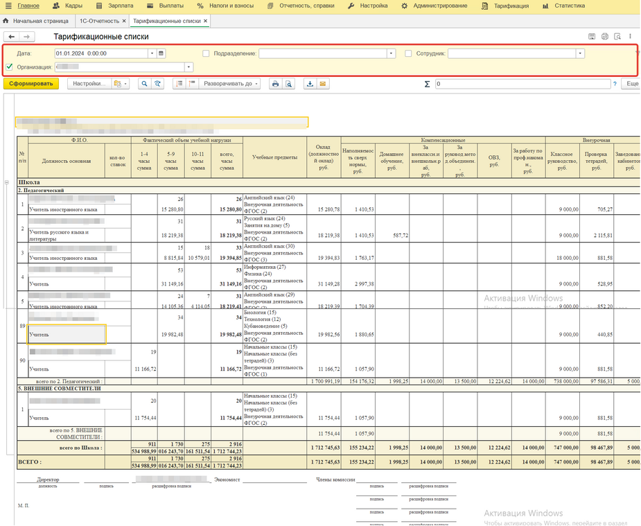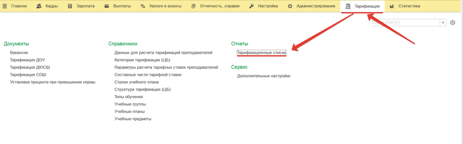 В разделе "Тарификация" → "Тарификационные списки" (рис.1) можно сформировать тарификационный список на любую дату, для любого подразделения и любого сотрудника (настраивается в шапке документа). (рис.2) Данный отчет отражает в себе все данные которые были внесены документами "Тарификация" на дату формирования отчета.