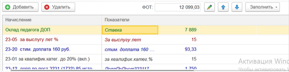 Вид плана можно взять поставляемый от 1С или же создать самому, на форме 3 табличные части, они нужны для расчета оклада по разным статьям. В поле «Статья финансирования» над колонкой, нам нужно создать «Составную часть тарифной ставки» у нас она называется, пример «Основной бюджет (для ПДО 18)» внутри задаем формулу (рис. 1, для остальных 2-х колонок параметр «Часы» должен быть отличен, т.е. Часы1, Часы2) по которой будет происходить расчет оклада, на вкладке бухучет задаем статью финансирования. Так же есть поле «Часы» на форме, это нагрузка сотрудника по этой статье, «Период регистрации» дата с которой начинают действовать надбавки, в самой табличной части мы можем выбрать «Учебный предмет», далее если есть данные для заполнения по другим статьям, заполняем другие табличные части. В табличную часть «Начисления» попадут начисления по сотруднику, можно так же через кнопку "Добавить" и при необходимости убрать ненужное начисление у сотрудника, нажав на кнопку "Отменить", начисление поменяет цвет в зависимости от проделанных действий (рис. 2):