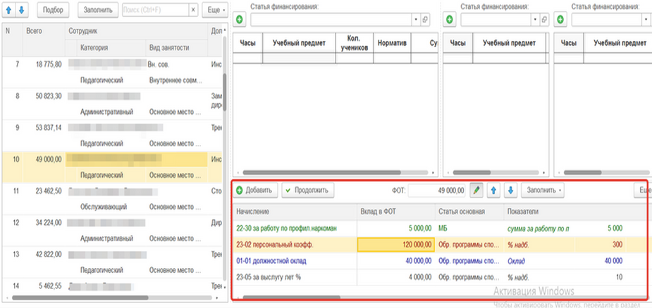 После заполнения табличных частей с нагрузкой необходимо заполнить начисления по сотруднику в табличной части начислений (если этого не было сделано ранее). Сделать это можно так же через кнопку «Добавить» и при необходимости убрать ненужное начисление у сотрудника нажать на кнопку «Отменить», начисление поменяет цвет в зависимости от проделанных действий (рис. 6):