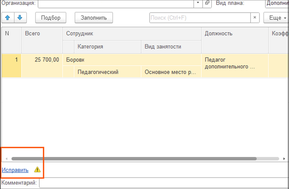 Всё происходит аналогично перетарификация ДОП, перетарификация ДЮСШ производится созданием нового документа «Тарификация ДЮСШ» в разделе «Тарификация» → «Тарификация ДЮСШ» → «Создать». Далее: если нужно перетарифицировать несколько сотрудников → нажимаем на кнопку «Подбор» и выбираем необходимых сотрудников; если перетарификация должна коснуться всех сотрудников → нажимаем кнопку «Заполнить», в табличную часть «Начисления» попадут действующие у сотрудников надбавки. Так же, как и в первичной «Тарификации ДЮСШ», меняем надбавки и не забываем за документ перерасчета заработной платы. ВАЖНО ПОНИМАТЬ, что перетарификация (изменения) на один и тот же день, не может быть сделана просто созданием нового документа т.е., если тарификация создана 01.01.2024 года, то ее следующее изменение может быть не ранее 02.01.2024 года, но если вам нужно перетарифицировать сотрудника на дату, на которую уже есть «Тарификация ДЮСШ», вам нужно зайти в старый документ и нажать кнопку «Исправить» (рис. 7).