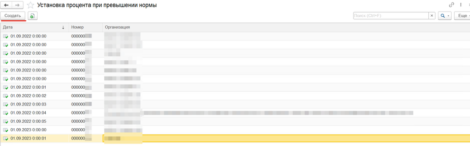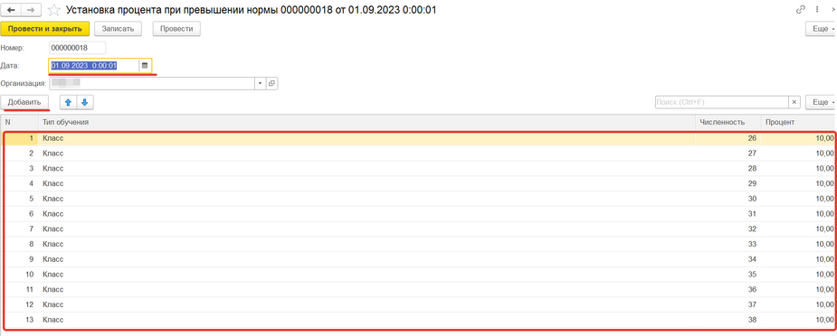 В разделе «Тарификация» есть документ «Установка процента при превышении нормы», который необходим для начисления надбавки, если в классе учеников больше положенной нормы. (рис.1) По кнопке «Создать» (рис.2) необходимо создать и заполнить данный документ, указав дату, организацию и через кнопку «Добавить» заполнить табличную часть с указанием типа обучения, численности учеников и процент надбавки за эту численность, как в примере. (рис.3)