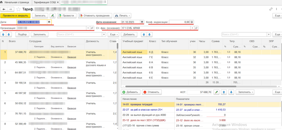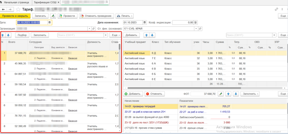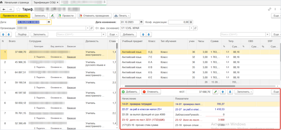 Так же в данном документе можно тарифицировать всех остальных сотрудников без пед. нагрузки, только внося изменения в табличную часть с начислениями.