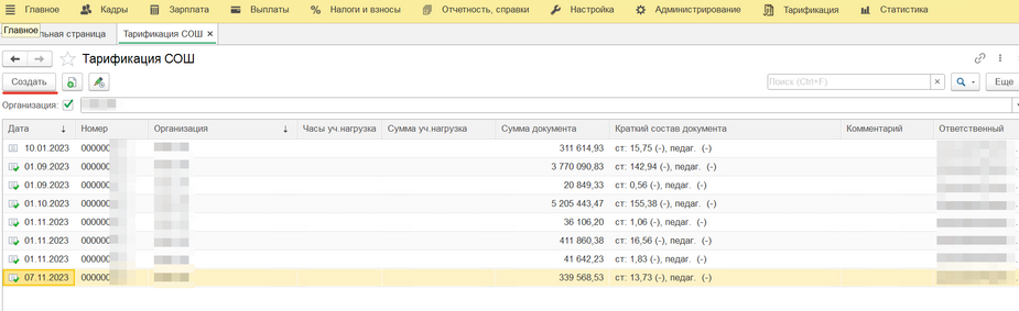 В разделе "Тарификация" существуют документы "Тарификация СОШ" (рис.1), соответственно здесь находятся все документы тарификации. (рис.2) В начале работы у вас должен быть единственный документ тарификации, который появился в результате заполнения вами таблиц excel (данный документ тарификации ОБЯЗАТЕЛЬНО нужно проверить и изменить ошибочные сведения). Через кнопку "Создать" (рис.2) можно создать новый документ тарификации (пере тарификации). Сам документ выглядит следующим образом: