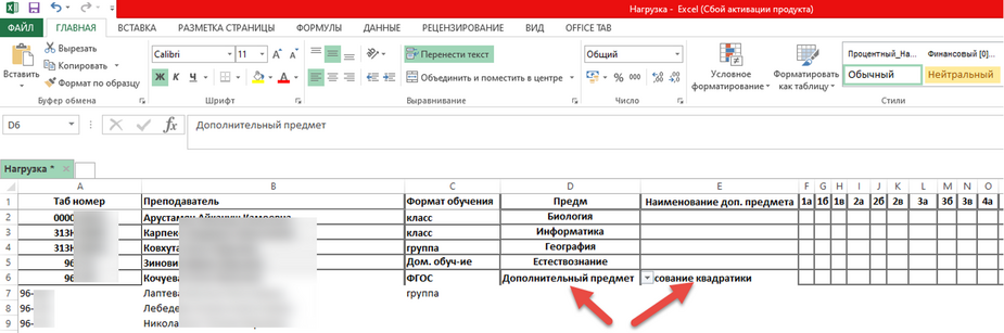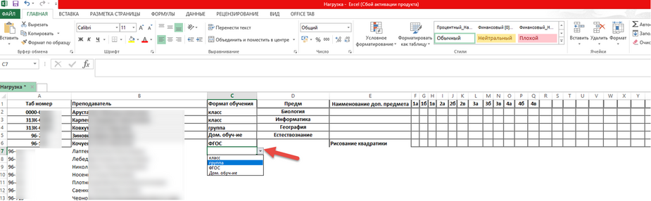6. После того как учителя со своими табельными номерами скопированы, мы приступаем к заполнению формата обучения и предмета, данные столбцы заполняются ТОЛЬКО из уже предложенных вариантов, руками вносить ничего нельзя, при нажатии на поле появляется стрелочка вниз, нажимаем на неё и выбираем формат и точно так же предмет. (рис.6) Если вашего предмета нету в списке, то необходимо указать «Дополнительный предмет» и в следующий столбик уже на клавиатуре написать его написать его наименование. (рис.7)
