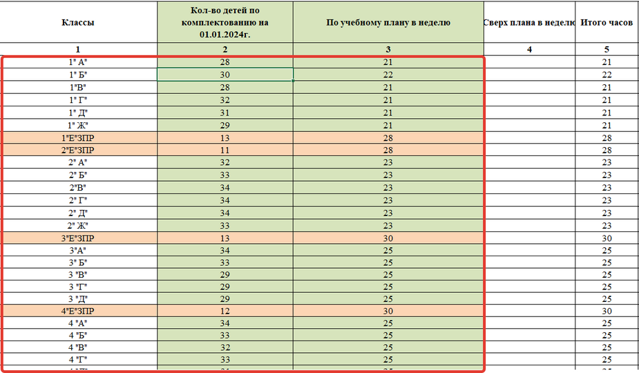 7. Далее напротив учителя где уже идут классы мы указываем количество часов в неделю у этого учителя по данному предмету.