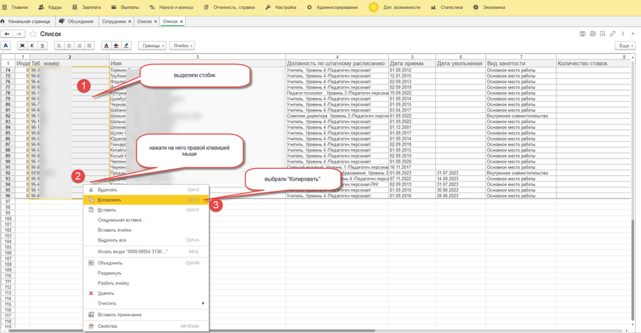 2. Надо выделить столбик «Таб. номер» нажать правой клавишей мыши и выбрать «Копировать». (рис.2)