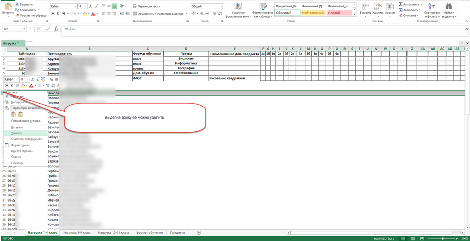 5. Так как у нас 3 листа «Нагрузка 1-4 класс», «Нагрузка 5-9 класс» и «Нагрузка 10-11 класс», то лишние строки учителей, которые не относятся к этим классам мы удаляем. (рис.5)