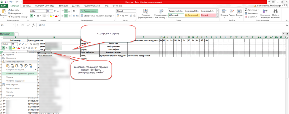 8. Если учитель ведет несколько классов или предметов, то необходимо скопировать строку (выделив строку) этого учителя и вставить (Вставить скопированные ячейки) в следующую. (рис.8)