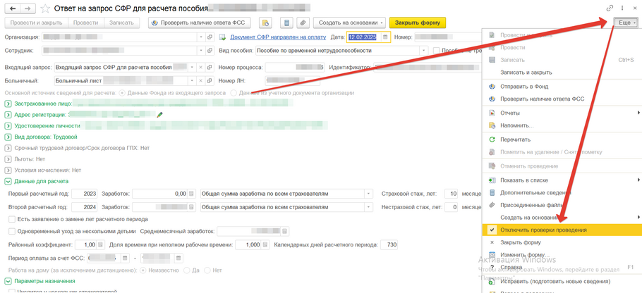 Для решения этой проблемы в ответе на запрос нужно нажать на кнопку "Еще" → поставить галочку на "отключить проверки проведения". Данные действия отключат проверку и получится провести ответ.